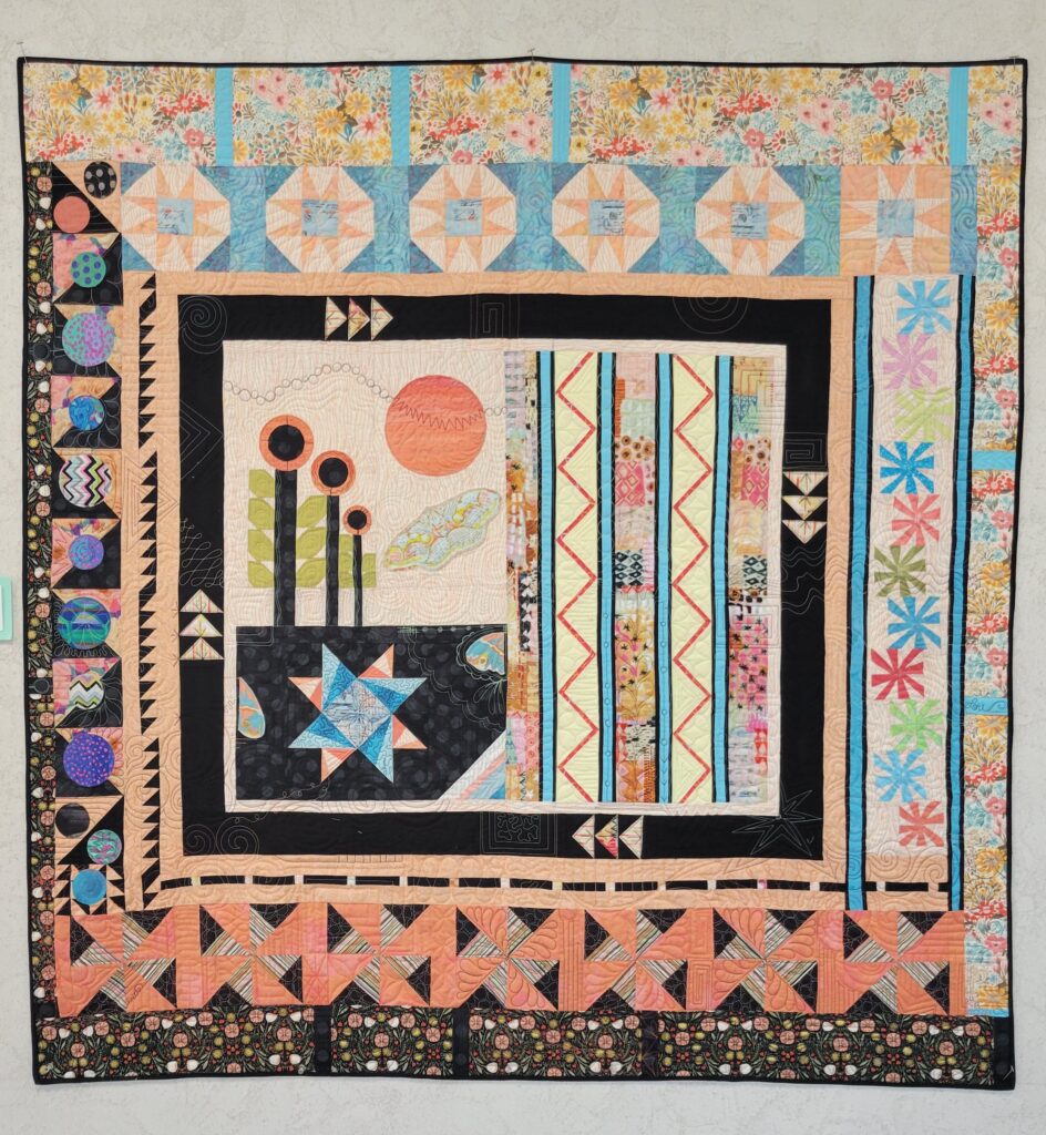 This year has two exciting themes. First, the Guild Challenge this year was “Your Take on Log Cabin Quilts.” Members were asked to create a small piece that uses any variation of a traditional log cabin quilt block. Second, some of the guild members joined a Round Robin Rebellion. This is a fun process where a quilt is started by the owner and then passed to another member each month who then adds their own unique fabrics and design choices. These quilts were passed three or four times before being returned to their owners to finish.